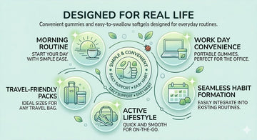 Convenient gummies and easy-to-swallow softgels designed for everyday routines.