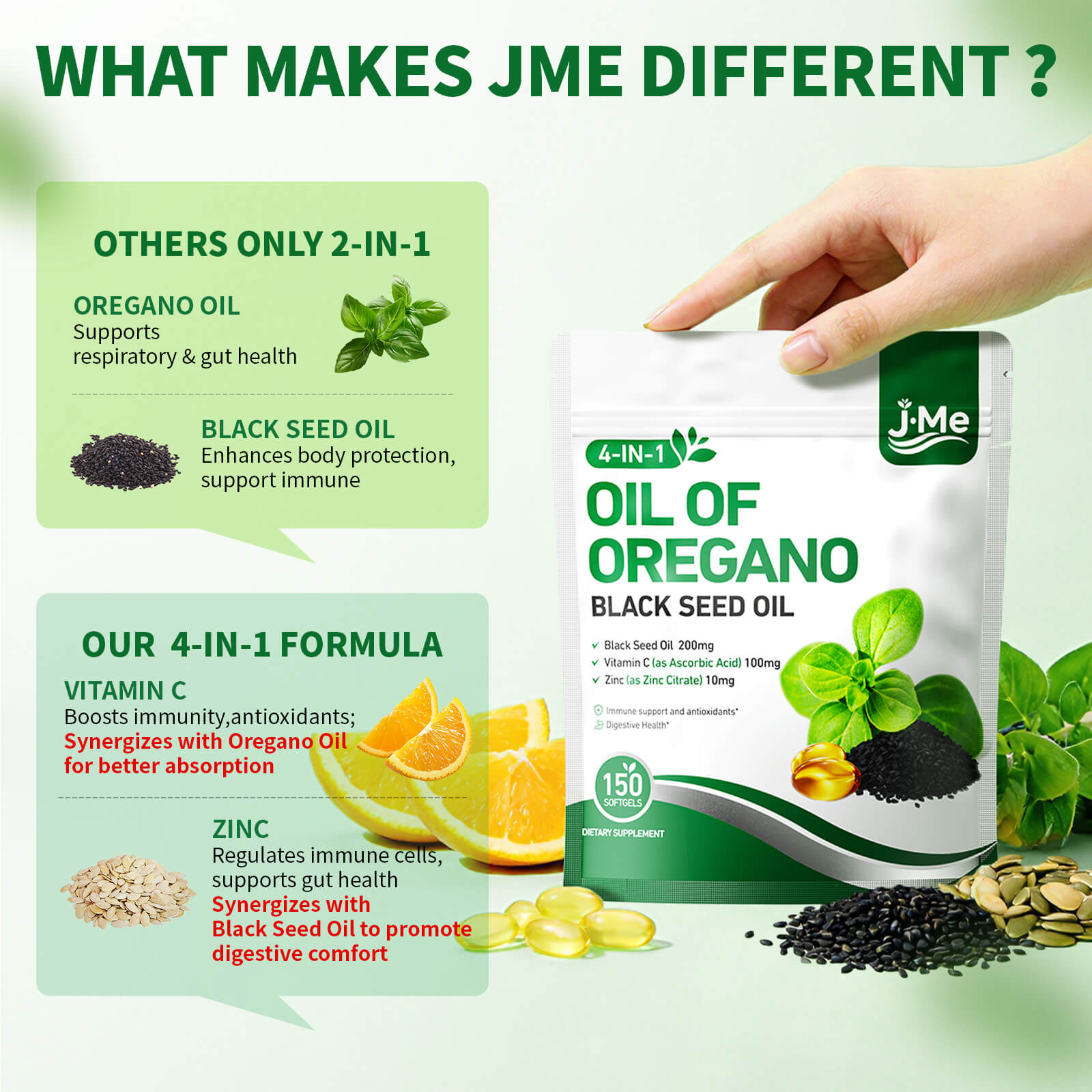 "JMe 4-in-1 Oil of Oregano with Black Seed Oil combines oregano oil, black seed oil, vitamin C, and zinc in one softgel.*